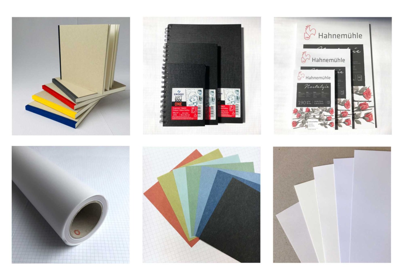 - Skizzenhefte in den Formaten A6, A5, A4, A3 sowie Sonderformaten