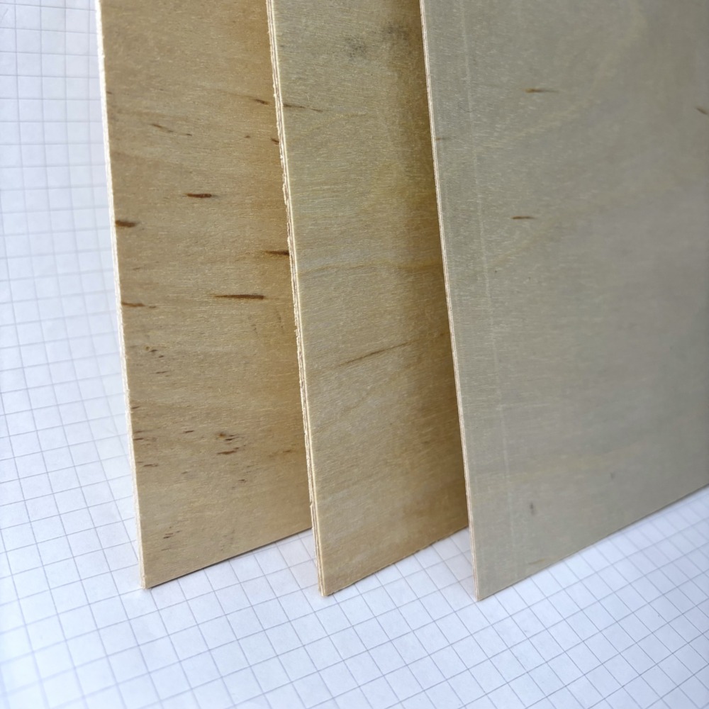 - Birken-Flugzeugsperrholz (Abb. unten): 1mm, 1.5mm und 2mm. Formate 245x490mm oder 500x1000mm